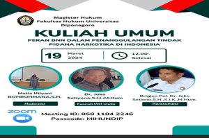 University of Diponegoro’s Master of Law Program Holds a Public Lecture on Combating Narcotics in Indonesia Diponegoro, March 19, 2024 – The Master of Law